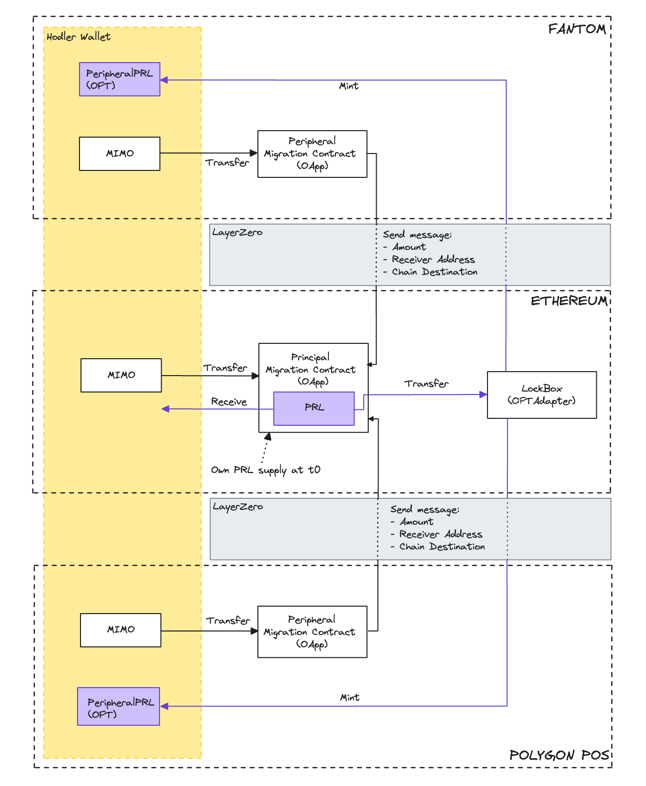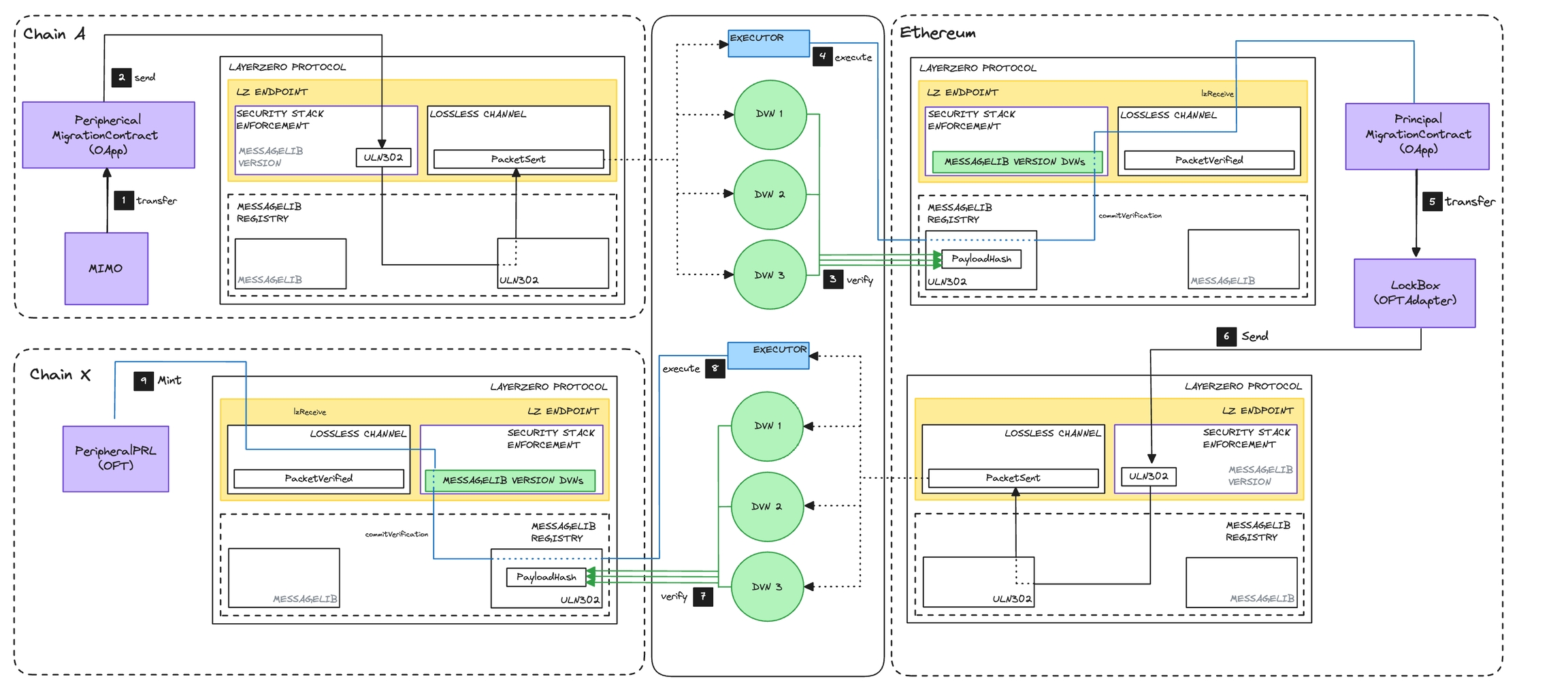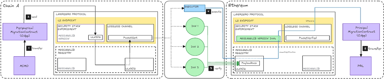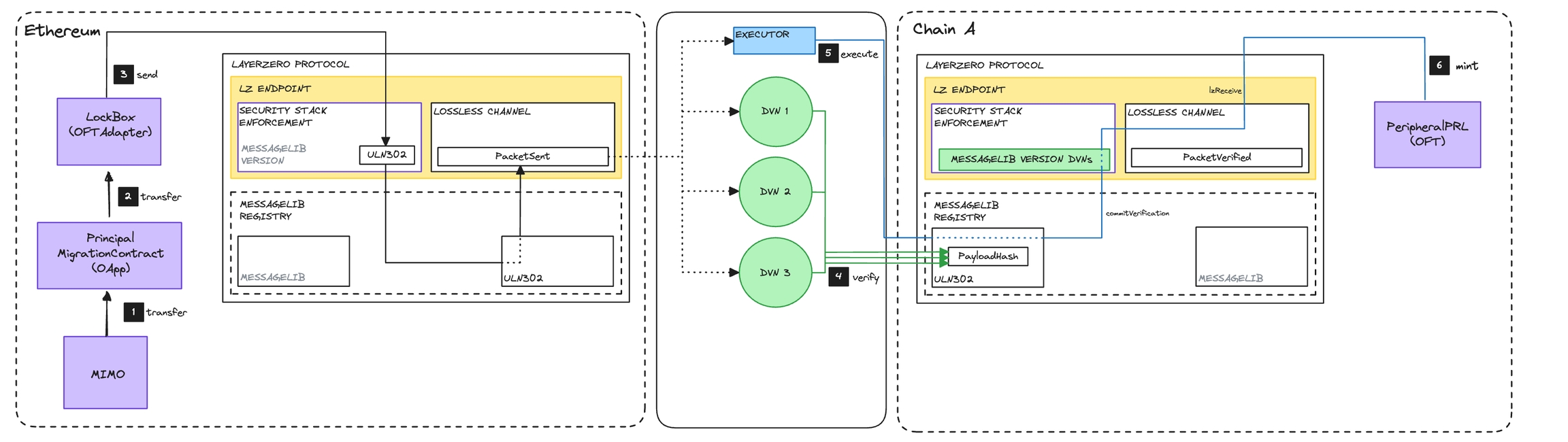 PrincipalMigrationContractandPeripheralMigrationContractcontracts that leveraging on LayerZero's OApp standard for migrating Mimo from anychain to PRL on anychain.The Bridging of PRL, handled by the
