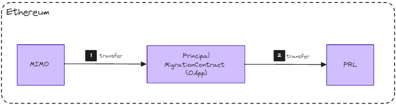 The PrincipalMigrationContract is the main migration contract that will be deployed on the same chain as the PRL token. It will own the total supply of PRL at deployment and will allow users to migrate their Mimo to PRL on the same chain or by receiving omnichain messages from other chains. This contract inherits from LayerZero's OAppReceiver.