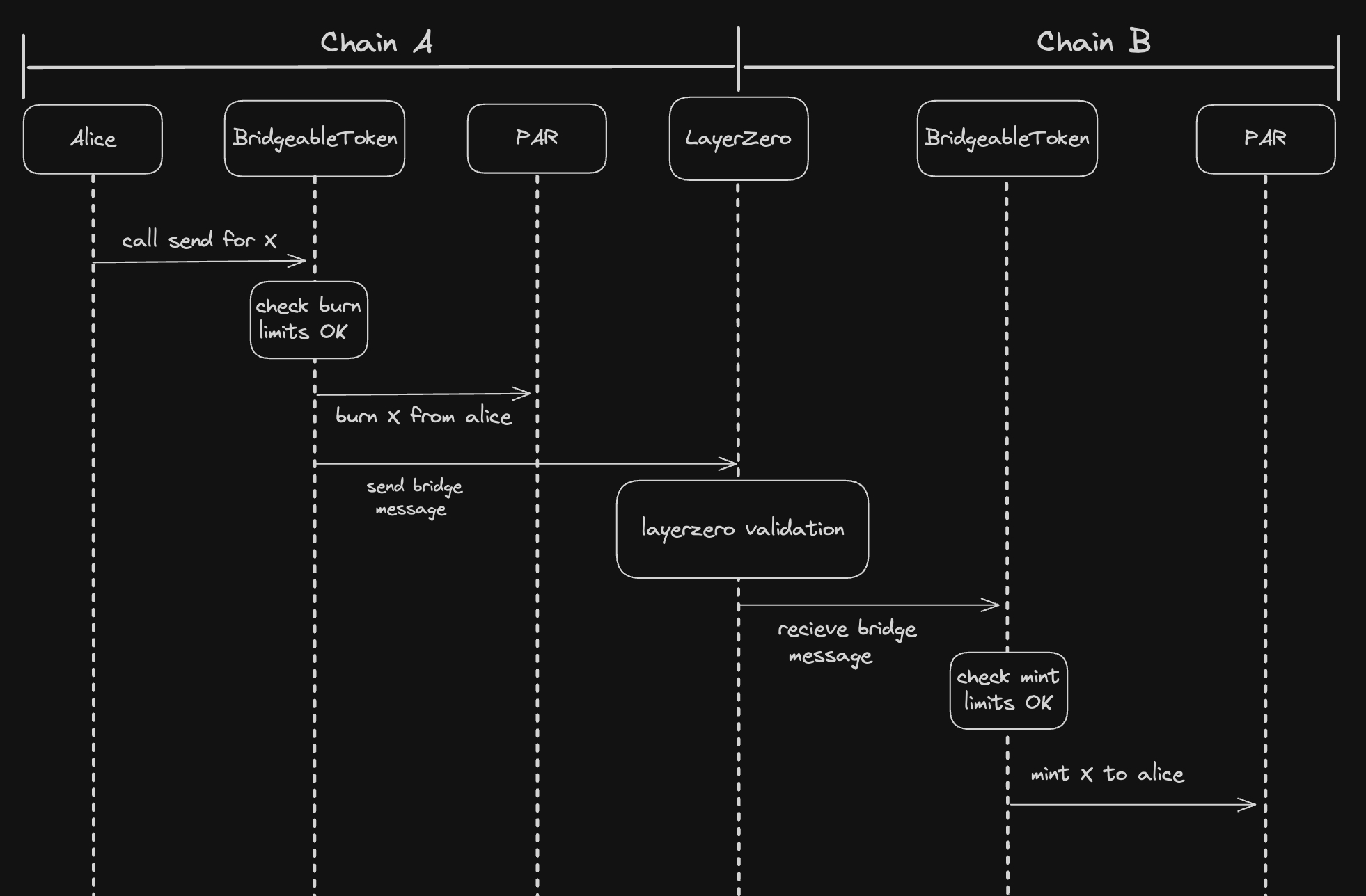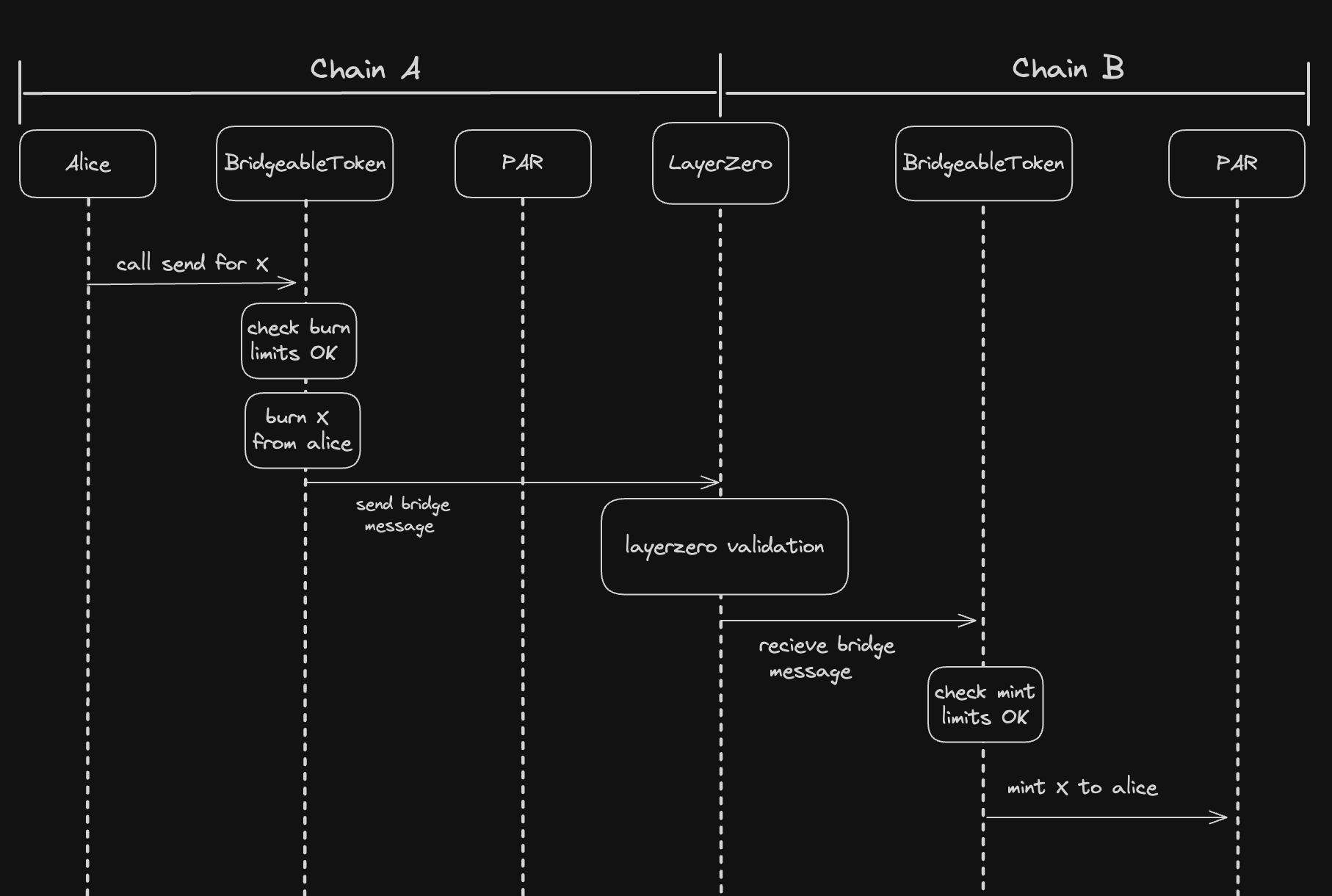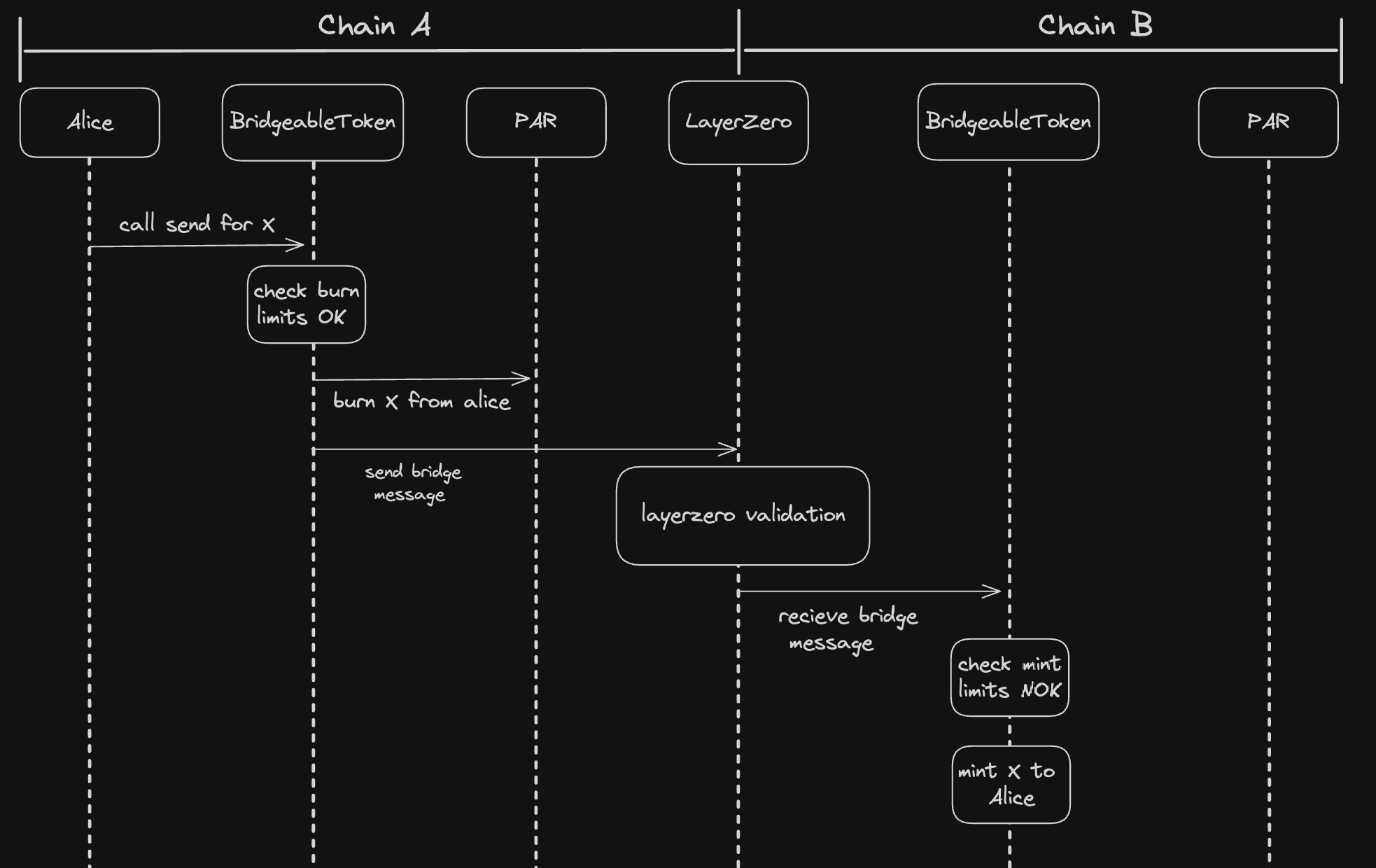 In this scenario, no limit is reached, and the user sends principal tokens. The user wants to send 100 principal tokens to another chain. The contract will burn 100 principal tokens and send a message to LayerZero to mint 100 principal tokens on the other chain.
